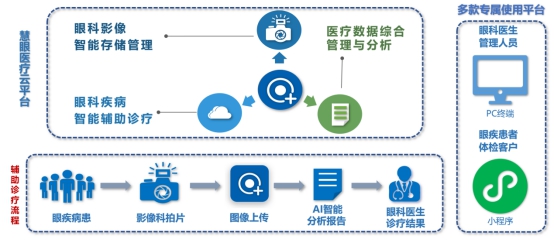 针对眼科医疗资源匮乏、早期诊断确诊率低、眼科医生工作压力大等问题,结合眼科大数据分析、智能辅助诊疗和应用场景多级联动,通过海量数据构建多种模型,实现1次拍片精准筛查眼疾病灶。其创新算法涉及视盘结构测量与分析、青光眼分类、血管分割与动静脉分类、糖尿病视网膜病变分类等等。尊重医生习惯设计使用流程,做到医疗数据管理可视化、工作协同化和流程标准化,构建智能病历、影像管理、辅助诊疗、数据分析、远程筛查等五大核心功能覆盖诊疗全流程。