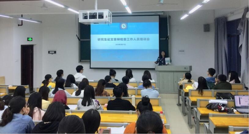 为进一步规范我校研究生毕业(学位)论文答辩,提高检查人员工作素质,2019年春季研究生毕业(学位)论文答辩检查工作人员培训会于2019年5月17日19:00-21:30在博文楼南805举行,60多名研究生检查员接受了培训。本次培训会由学校研究生学生会的学术部组织,研究生院副院长蒋洁霞指导并主持。