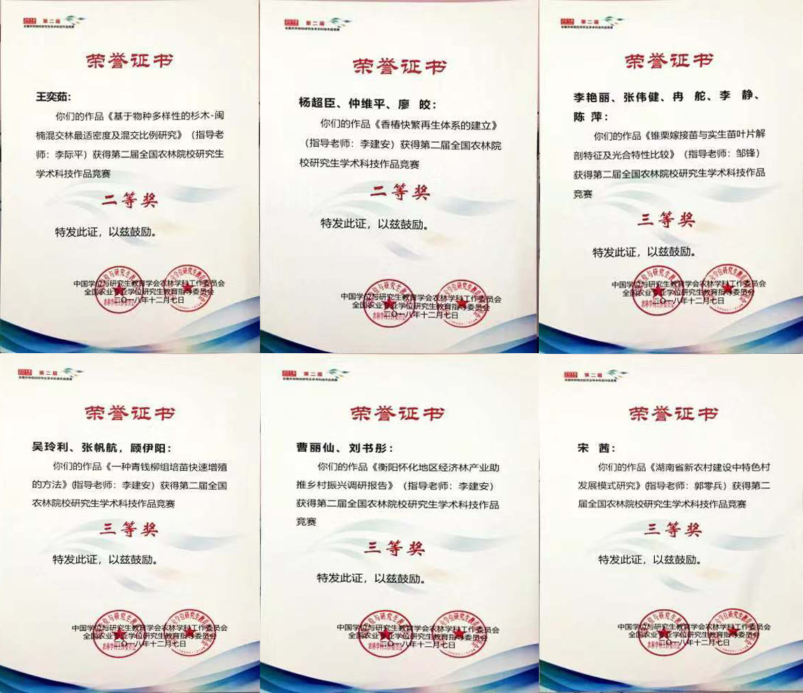 我校参赛研究生虽未入围决赛,但依然收获颇丰,林学院的王奕茹同学和杨超臣同学团队分别荣获二等奖,荣获三等奖的有李艳丽同学团队﹑吴玲利同学团队﹑曹丽仙同学团队以及宋茜同学团队。林学院李河副教授和张盛培博士代表我校师生参加了决赛现场和颁奖典礼。