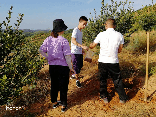 19日下午,实践团来到常宁市三角塘镇梅花村。在当地油茶基地唐老板陪同下,通过村书记了解了梅花村目前主要发展的经济产业。当地主要种植油茶、杉树,水稻,并通过政府对当地油茶种植的扶持与补贴,建立了油茶种植地区道路通车等基础设施,该地区“常宁茶油”已经成为知名品牌。20日当天,实践团上山参观了该地区不同类型的油茶林。随后针对该地立地条件,实践团对土壤进行了初步采样调查分析。
