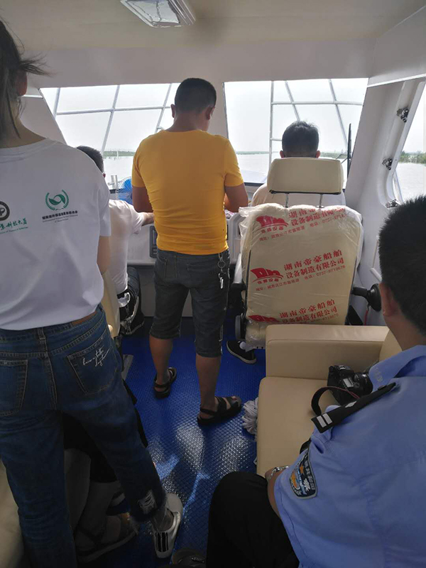 结束对青山岛管理站的考察后,调研团队部分成员跟随湘阴县林业局、公安局巡湖小组,深入洞庭湖中心开展巡湖活动。在巡湖过程中发现一艘疑似非法捕鱼的船只,以夏局长为首的巡湖小组对船只例行检查,并要求其立即驶离横岭湖的核心区域。