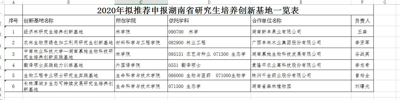 根据湖南省《关于申报2020年湖南省研究生教育创新工程和专业能力提升工程项目的通知》(湘教通〔2020〕80号)文件的要求,我校组织开展了2020年度湖南省研究生培养创新基地的申报工作。经过各学院申报、学校组织专家评审,现拟推荐以下6个单位申报湖南省研究生培养创新基地,详情公示如下,公示期为5月27日-5月29日,公示期内如有异议,请以实名的方式将意见反馈至研究生院。联系人:金文芬。联系电话:85623032。