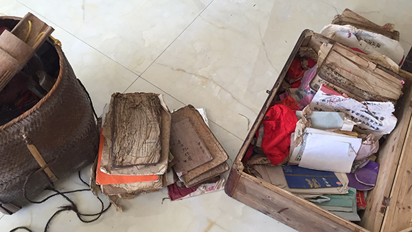7月23日上午,实践团队拜访了省级非物质文化遗产打古堂的传承人陆大献先生。陆大献先生是当地有名的法师,2004年日本伸奈川大学与中国民协联合资助举办的开国以后的首次打古堂活动及2009年申请国家级非遗举办的打古堂活动,他都是为主的法师(当地称为师公)。陆先生讲述了很多打古堂活动的细节及其学艺的经历,展示了他的法器,并翻阅了一些法事经文的古书籍。