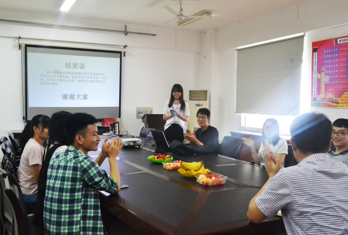 李文广同学以“化学既是科学又是艺术”为主题和与会研究生作了交流。他谈到,化学是一门科学,我们可以通过学习专业化学知识去了解,化学还是一门艺术,我们利用化学知识,经过反复的创造性实践可以改变世界。随后,他以绿色合成化学的应用为例,号召师弟师妹们要以兴趣为导师,努力学习专业知识,造福社会。另外,他还分享了读研期间的心得体会和自己在学习生活中遇到困难时的解决办法。
