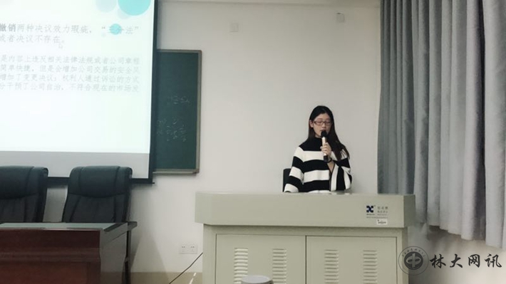韩晓玥同学以《房屋涨价损失赔偿模式研究》为题,就其对房屋涨价问题的研究以及该篇论文的写作感想做了报告与分享。韩晓玥认为,房屋涨价损失本质上是一种可得利益损失,其作为补偿性赔偿可以与惩罚性赔偿同时适用。韩晓玥讲述了此篇论文发表过程中所遇到的困难,以及发表之后的感想,她认为,经历过困难之后才能真正克服对写作的恐惧;潘姮利同学以《公司决议效力问题探析》为题,围绕最近施行的公司法司法解释四中相关条款,与民法总则结合,探讨了公司决议效力与股东会、董事会的决议效力问题,并对公司决议效力分类的两分法、三分法、四分法进行分析,主题之新颖深受欢迎;郭姗姗同学以《八达岭野生动物园老虎伤人案之法律问题分析》为题,从侵权责任和违约责任两个角度分析了动物园老虎伤人的法律问题,并逐一分析了此案中两种责任的构成要件,认为此案是侵权责任与违约责任的竟合,应择一适用。郭姗姗同学收集了大量数据进行论证,图文并茂,十分精彩。