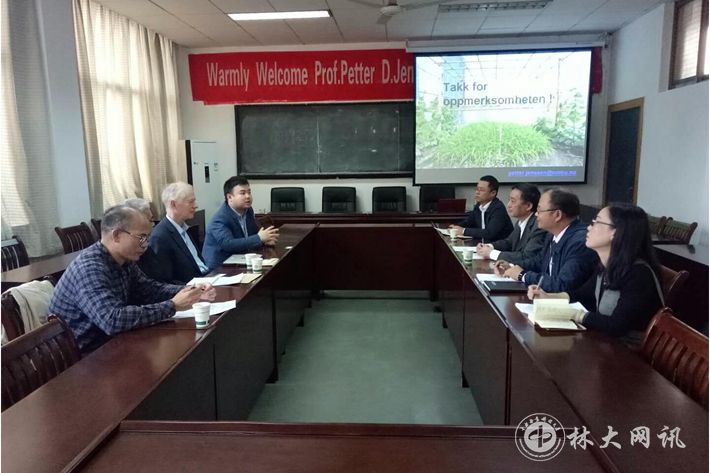 【林大网讯】(文/环境科学与工程学院 邓梁) 11月3日下午,挪威农业大学的Petter Deinboll Jenssen教授和Manoj教授应邀到我校进行学术交流,并在报告会上作主题为“Green cities-hubs in a circular economy”的报告。报告会由环境科学与工程学院院长王平主持。